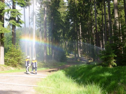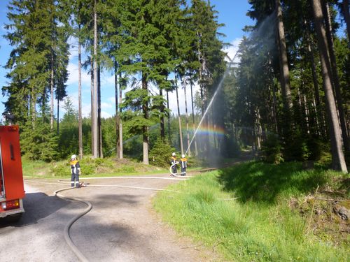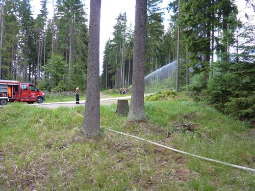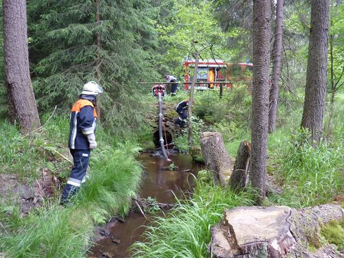 Bei eintreffen an der „Einsatzstelle“ entschied man den in ca. 100 m entfernten Steinbach für die Wasserentnahme zu nutzen. Da es seit längerer Zeit nicht mehr regnete war jedoch der Wasserstand daher auch nicht sehr hoch, so dass der Ansaugkorb nur knapp unter die Wasseroberfläche abtauchte. Herumliegende Steine und Hölzer nutzte man schließlich um den Bachlauf anzustauen. Und es funktioniert auch.