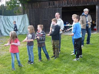 Beim Eierlauf und beim Hindernisparcour war Geschicklichkeit gefragt. Am meisten Spaß hatten die Waldindianer jedoch beim Tauziehen. Davon ließen sich auch die Väter anstecken und legten sich mächtig ins Zeug.